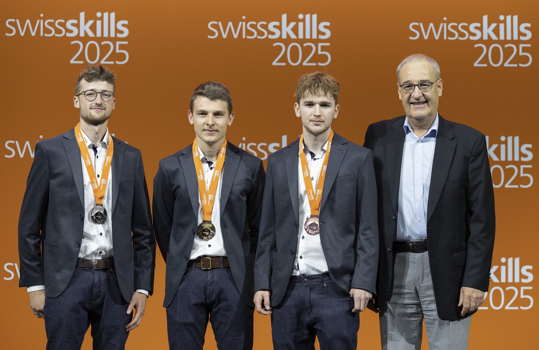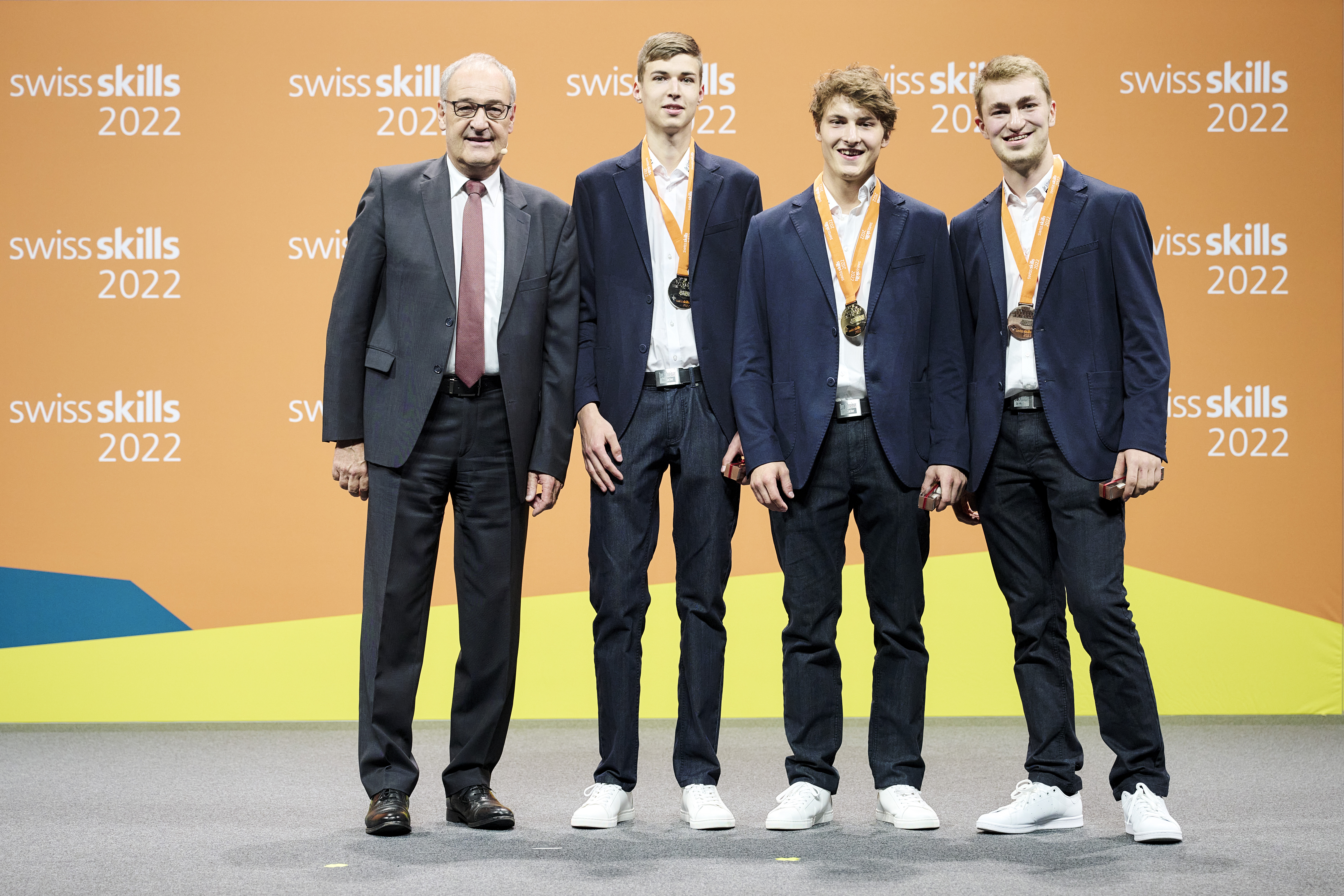 Foto, da sinistra a destra: Florian Länzlinger, Augustin Mettraux, Silvan Reichen, consigliere federale Guy Parmelin